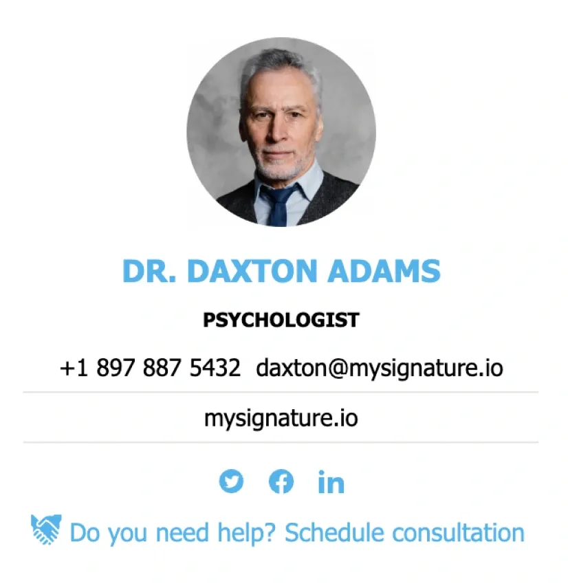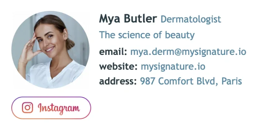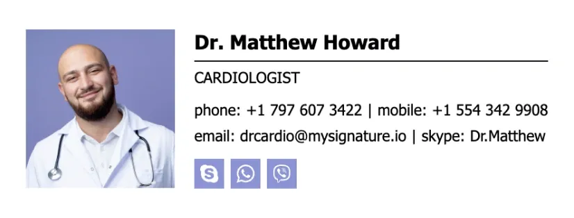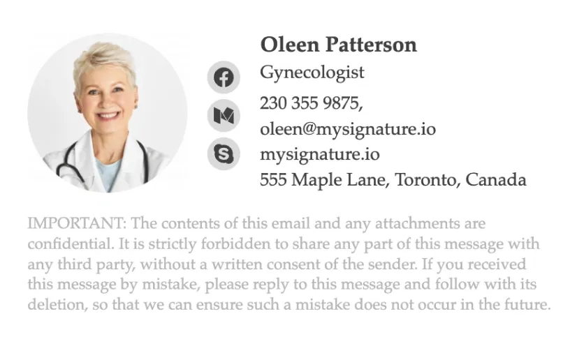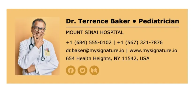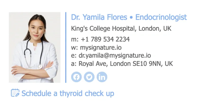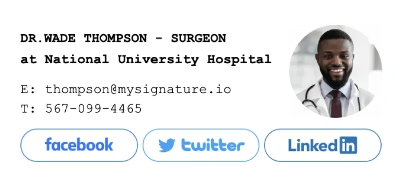 Crear una firma de correo electrónicoIncluir enlaces a perfiles de redes sociales en la firma de correo electrónico de un médico es opcional, pero en el mundo digital actual, puede ser una forma útil de compartir información valiosa con los pacientes. Si tienes un perfil profesional directamente relacionado con tu trabajo como médico, incluir un enlace puede ayudar a que los pacientes se mantengan informados y conectados con tu práctica médica. Cuando utilizas un buen creador de firmas como MySignature, puedes añadir íconos clicables en el pie de tu correo electrónico.