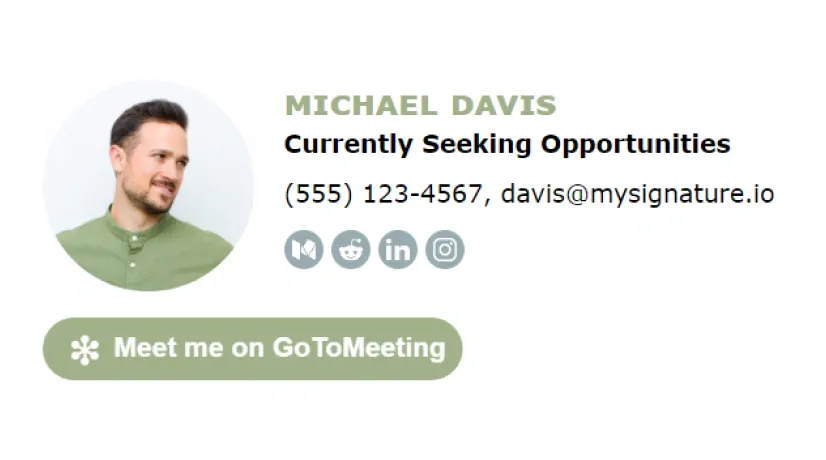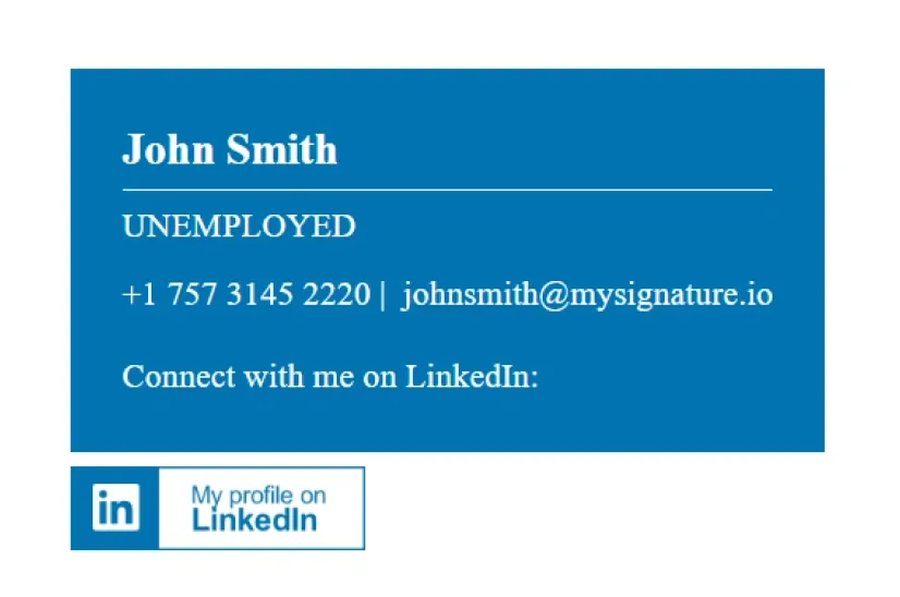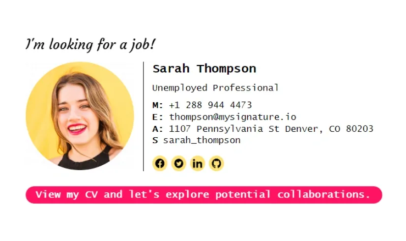Prueba estas plantillas de firmas de correo electrónico para buscadores de empleo. Más plantillas de firmas de correo electrónico diseñadas profesionalmente para cuando estés desempleado están disponibles en MySignature.