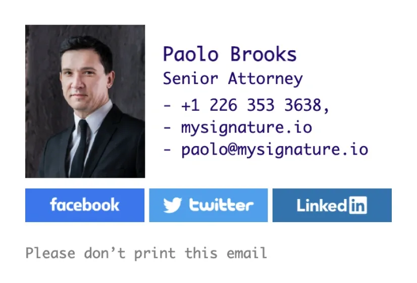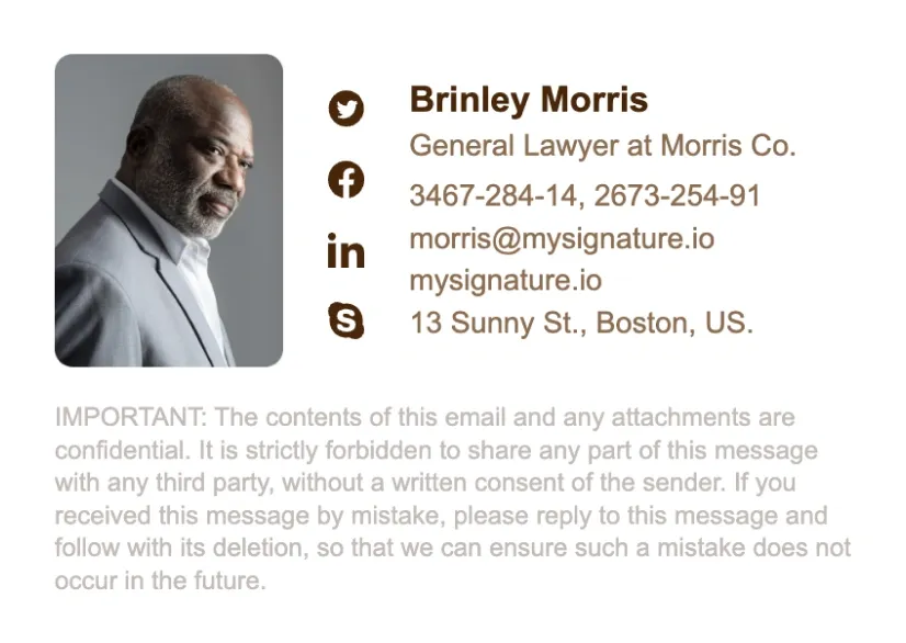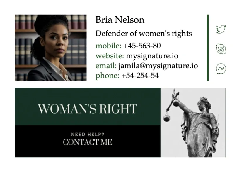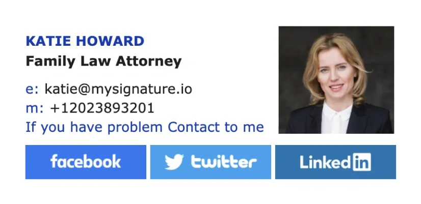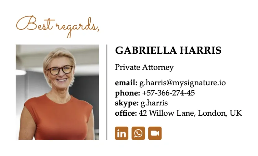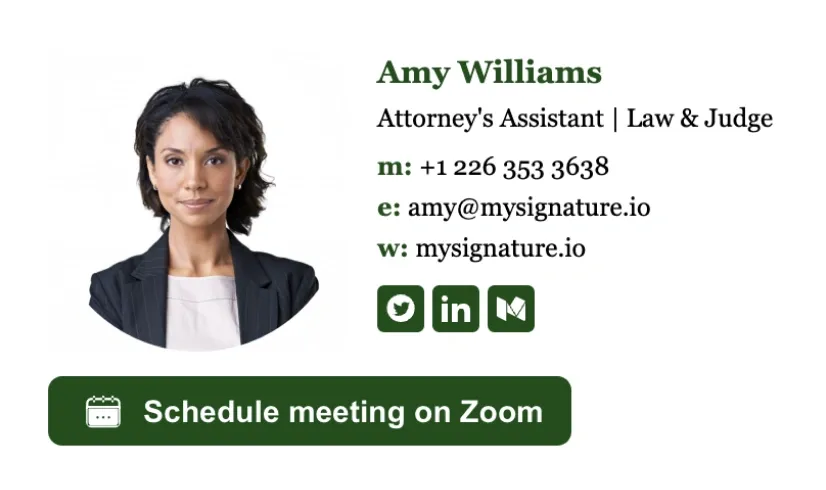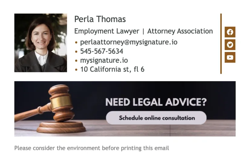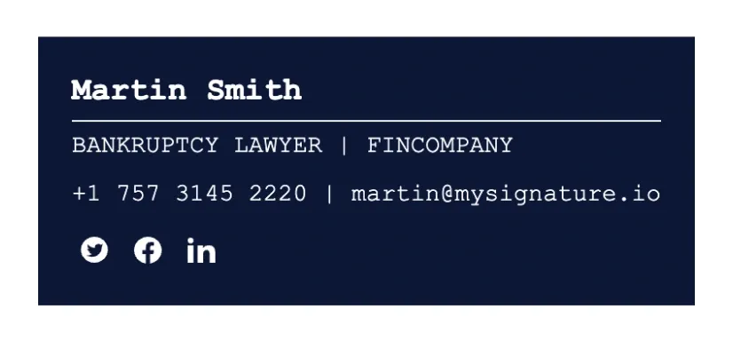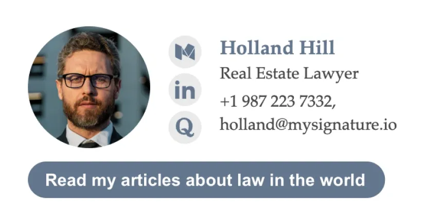 Los ejemplos de firmas de correo electrónico para abogados pueden ayudar a los letrados a crear pies de correo claros y significativos. En esta sección encontrarás las mejores plantillas de firmas de correo electrónico para abogados creadas con nuestro generador de firmas de correo electrónico MySignature.
