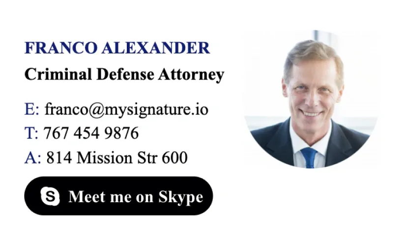 Crea una firma de correo electrónico para abogadoMejora tu comunicación por correo electrónico con MySignature. Nuestra potente herramienta ofrece una solución sencilla para crear firmas de correo electrónico impresionantes y profesionales, diseñadas específicamente para abogados y profesionales del derecho. Con plantillas personalizables y opciones de diseño, podrás mostrar tu experiencia y destacar en cada correo que envíes.