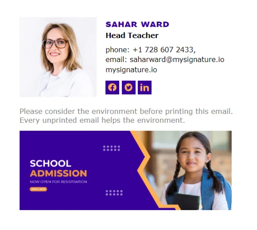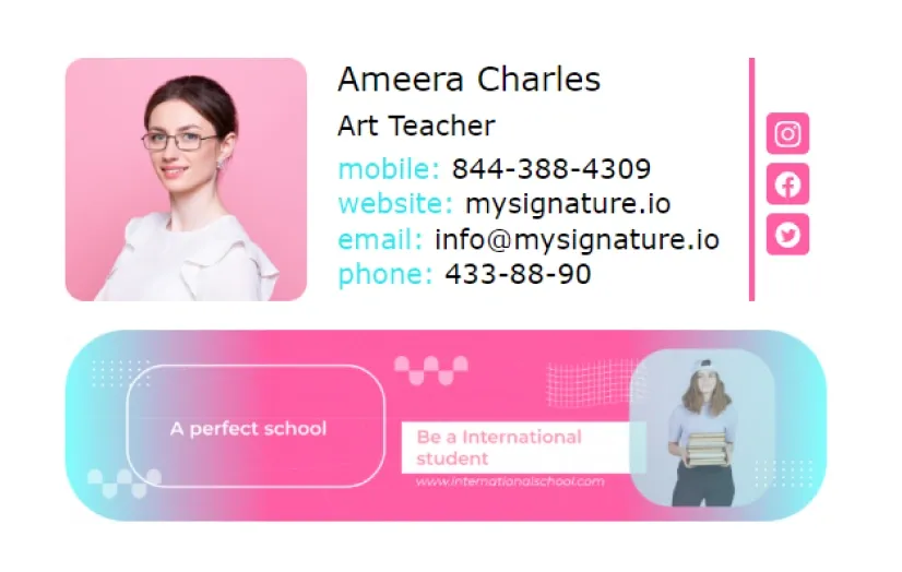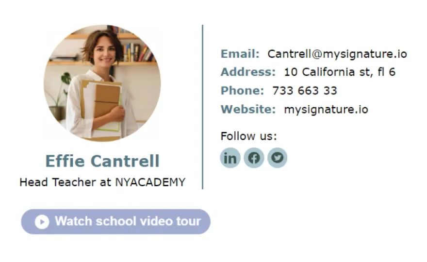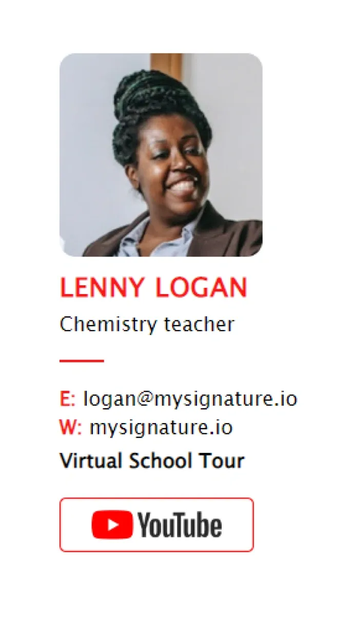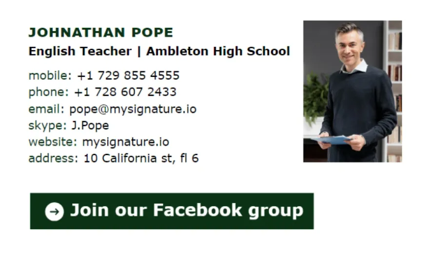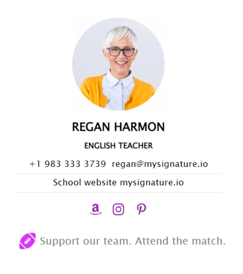 Si enseñas a nivel de secundaria, MySignature también cuenta con una variedad de opciones de firmas de correo electrónico para profesores. Revisa esta lista completa con las mejores firmas de correo electrónico para docentes que trabajan en una escuela secundaria.
