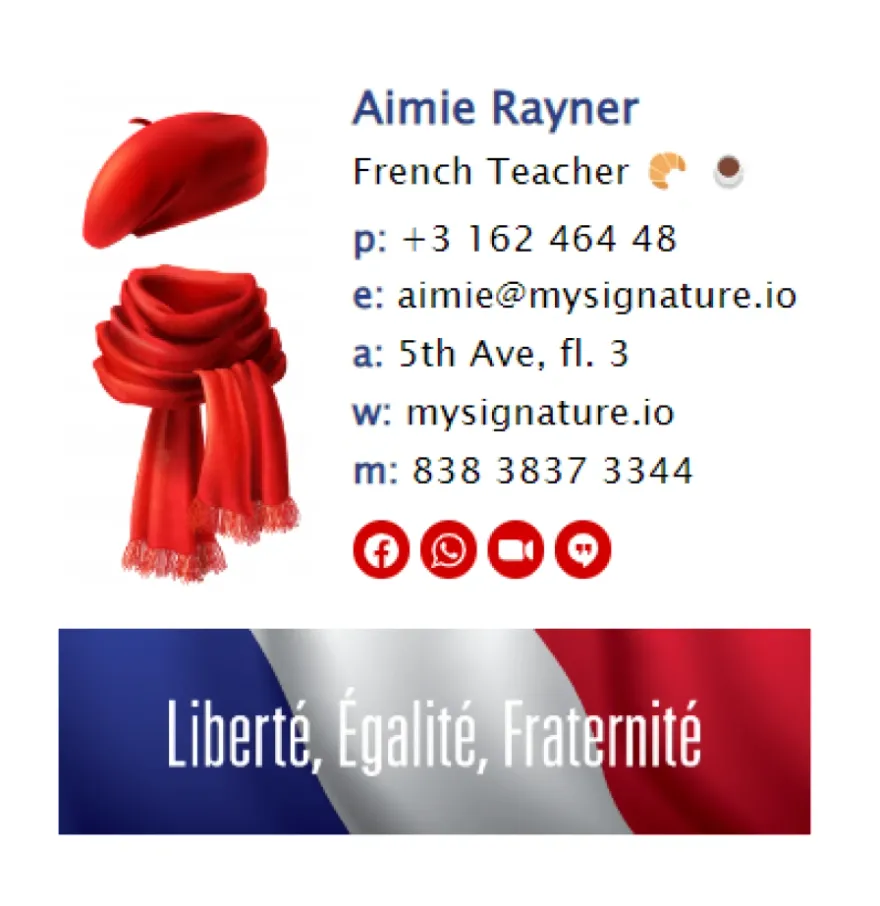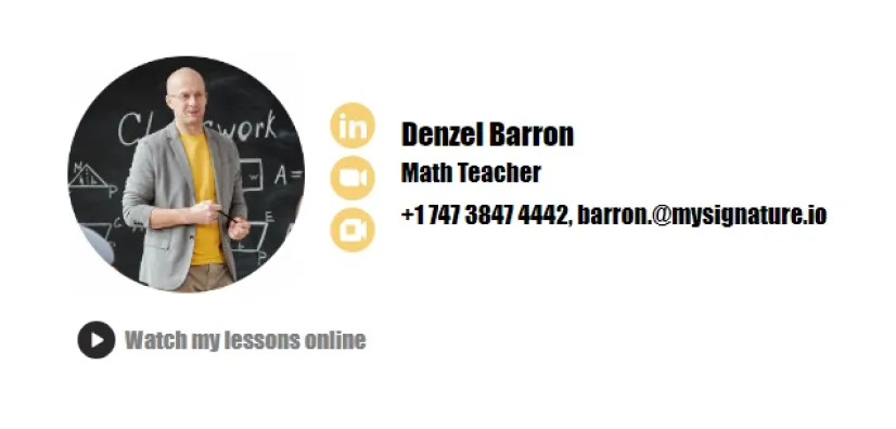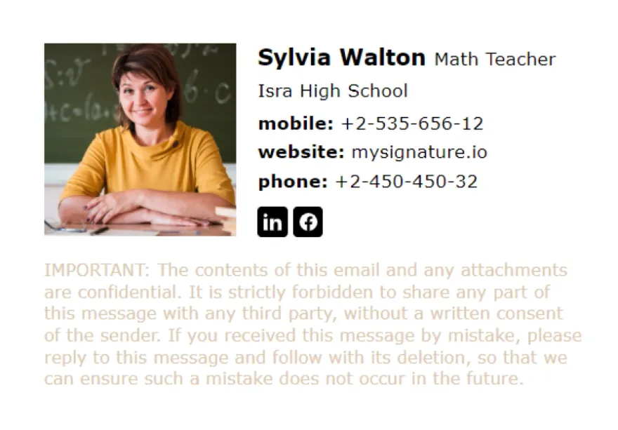 Crear una firma de correo electrónicoComo profesor, puede que te sientas tentado a incluir muchos recursos e información útil en tu firma de correo electrónico. Pero es importante recordar que, al mismo tiempo, tu firma debe ser breve para que sea fácil de leer y no sobrecargue todo el correo. Debes ser muy cuidadoso con la información que decides añadir y utilizar los diseños de plantillas profesionales para profesores de MySignature como fuente de inspiración.