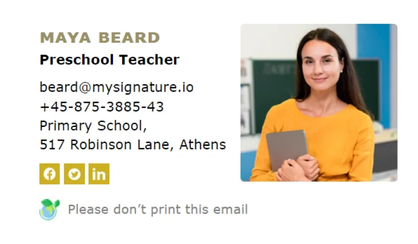 No tiene gráficos llamativos ni colores que distraigan. En su lugar, presenta un diseño limpio, unificado y profesional, con espacio suficiente para una foto y toda la información que estudiantes o padres podrían necesitar en un espacio reducido. Esta firma de correo electrónico podría tener más elementos, pero demuestra que, con un buen diseño, es posible incluir muchos detalles sin sobrecargar los correos. Y eso te será útil cada vez que envíes un mensaje a un estudiante o a un padre.